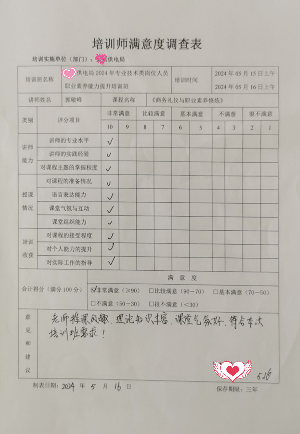 返聘!2024年5月16日,中國南方電網(wǎng)《職業(yè)素養(yǎng)修煉與商務(wù)禮儀》第二期課程完美收官!“壓力績效管理專家”郭敬峰老師再次受邀分享,伴隨著熱烈的團(tuán)體PK活動,大家積極投入體驗式培訓(xùn),激發(fā)內(nèi)在學(xué)習(xí)動機(jī),感受快樂學(xué)習(xí)氛圍,在工作中找到更多勝任感和成就感“職業(yè)高峰體驗”,課后《培訓(xùn)師滿意度調(diào)查表》滿分100!