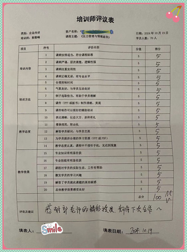 中國建筑集團某骨干企業(yè)《壓力管理與情緒疏導》完美收官!“壓力情緒管理專家”郭敬峰老師精彩分享:“壓力管理技巧、心理健康關愛、情緒疏導方法、現(xiàn)場解疑答惑等”。課程風趣幽默,寓教于樂,結合案例實操演練,充分調動學員積極性,工具方法落地,《培訓師評議表》滿分好評反饋,感謝大家熱情學習!